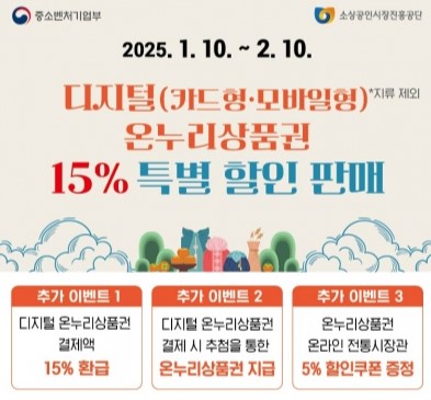 2025년 1월 10일부터 2월 10일까지 디지털 온누리상품권의 할인율이 기존 10%에서 15%로 상향 조정됩니다!