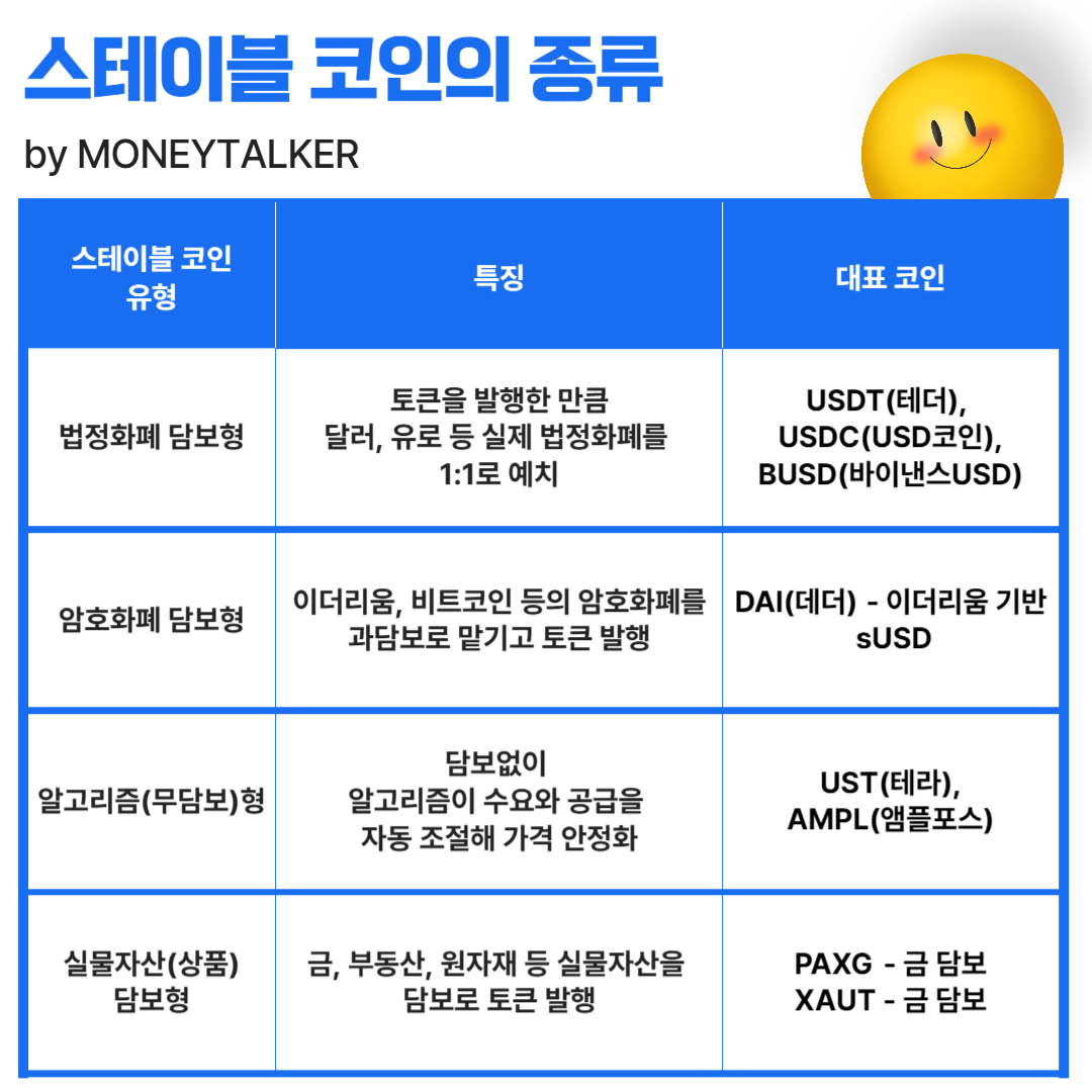 스테이블 코인은 담보 구조와 발행 방식에 따라 크게 네 가지로 구분됩니다