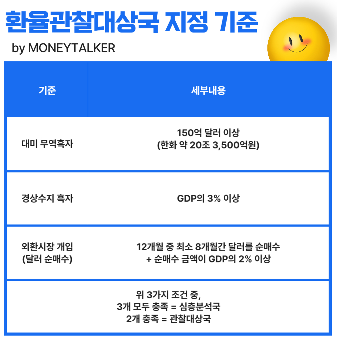 즉, 한국은 3가지 기준 중 대미 무역흑자와 경상수지 흑자 2개를 충족해 관찰대상국에 포함되었습니다.
