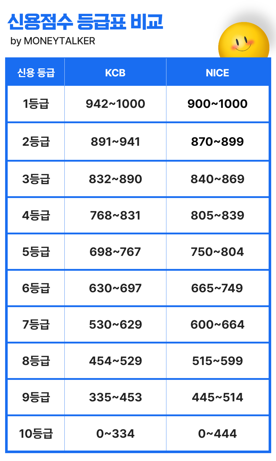 신용점수를 기준으로 등급을 나누면 위의 표와 같습니다.