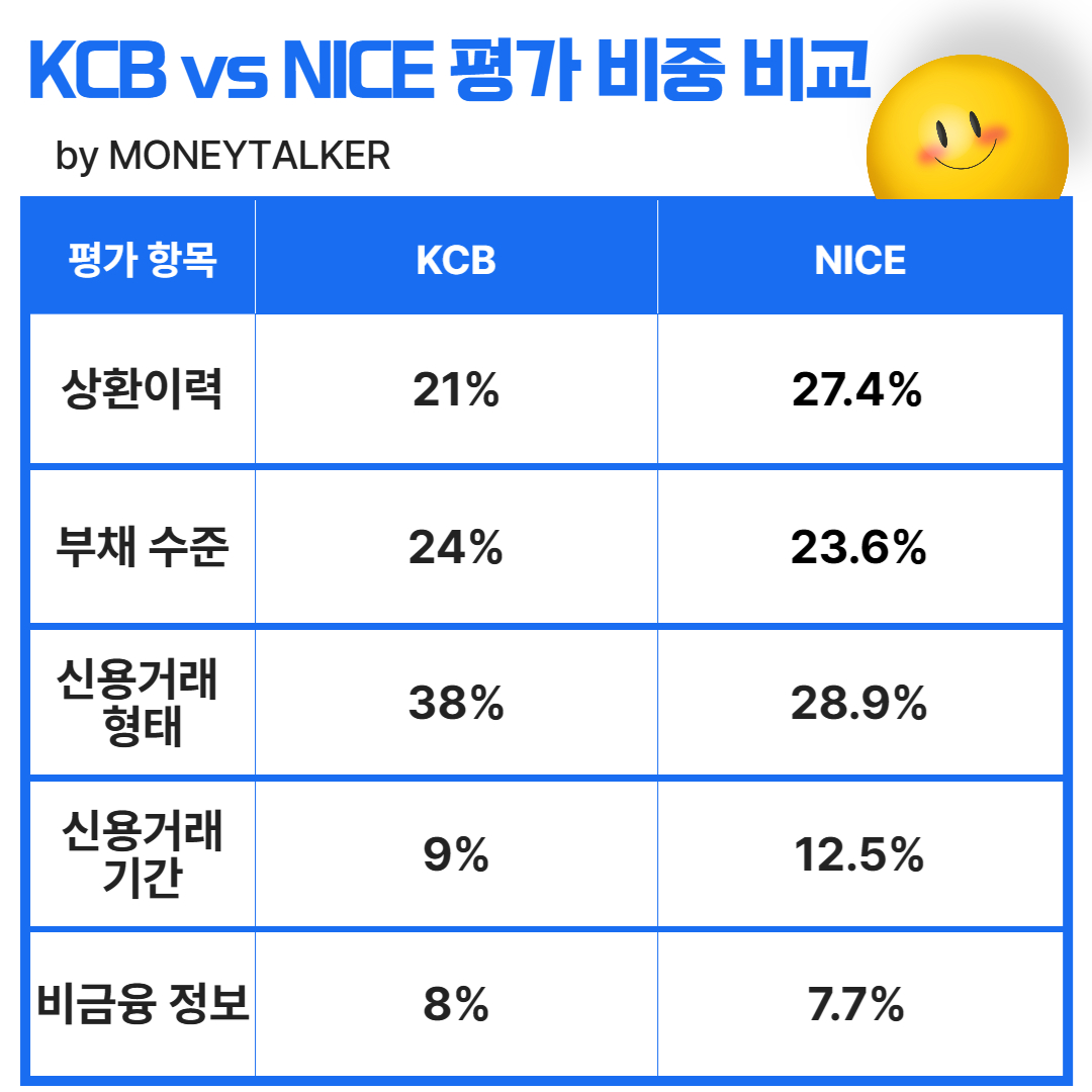 - KCB는 신용거래 형태, NICE는 상환이력에 더 큰 비중을 둡니다.